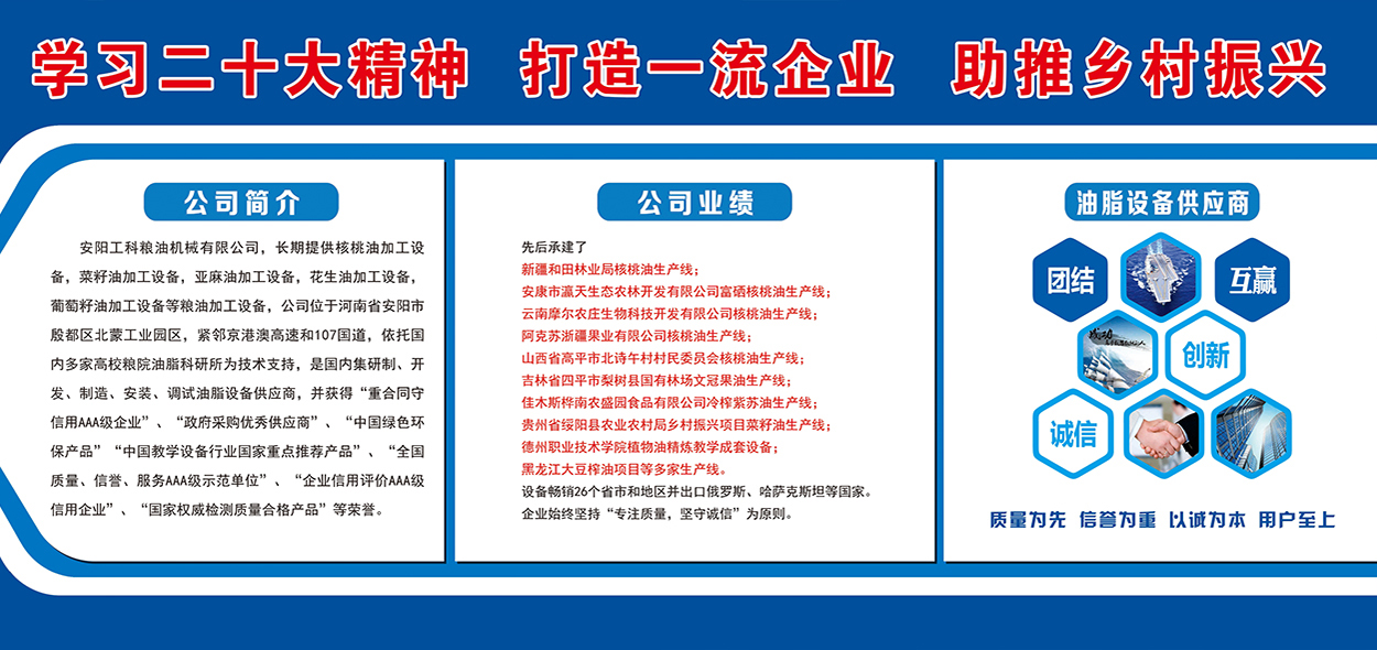 安陽(yáng)工科糧油機(jī)械有限公司,長(zhǎng)期提供核桃油加工設(shè)備,茶籽油加工設(shè)備,菜籽油加工設(shè)備,亞麻油加工設(shè)備,花生油加工設(shè)備,葡萄籽油加工設(shè)備等糧油加工設(shè)備,公司位于河南省安陽(yáng)市殷都區(qū)北蒙工業(yè)園區(qū),緊鄰京港澳高速和107國(guó)道,依托國(guó)內(nèi)多家高校糧院油脂科研所為技術(shù)支持,是國(guó)內(nèi)集研制、開發(fā)、制造、安裝、調(diào)試油脂設(shè)備供應(yīng)商,并獲得“重合同守信用AAA級(jí)企業(yè)”、“政府采購(gòu)優(yōu)秀供應(yīng)商”、“中國(guó)綠色環(huán)保產(chǎn)品”“中國(guó)教學(xué)設(shè)備行業(yè)國(guó)家重點(diǎn)推薦產(chǎn)品”、“全國(guó)質(zhì)量、信譽(yù)、服務(wù)AAA級(jí)示范單位”、“企業(yè)信用評(píng)價(jià)AAA級(jí)信用企業(yè)”、“國(guó)家權(quán)威檢測(cè)質(zhì)量合格產(chǎn)品”等榮譽(yù)。先后承建了新疆和田林業(yè)...